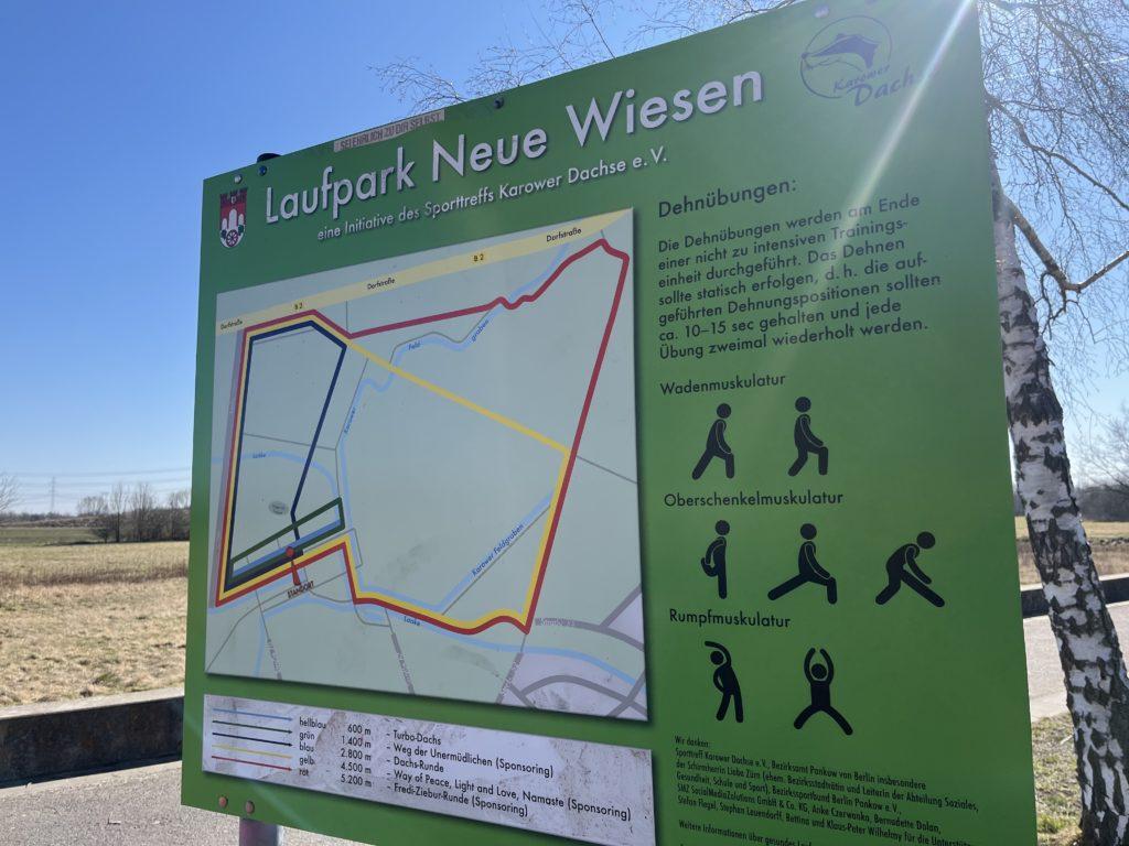 Bereits im Jahr 2013 hat der Sporttreff Karower Dachse e.V. den Laufpark im Stadtrandpark „Neue Wiesen“ initiiert. Das Gebiet befindet sich im Südosten des Karower Kiez-Zentrums und bietet für Hobbyläufer perfekte Voraussetzungen. Fünf verschiedene Laufrouten sind auf einem Schild in der Nähe der Skateranlage angebracht. Entsprechend der eigenen Lauf-Bedürfnisse kann eine Strecke zwischen 600 Meter und 5,2 Kilometer gewählt werden. Um sich nicht zu „verlaufen“ weisen entsprechend farbige Wegweiser auf dem Gelände zwischen Karow und der Bundesstraße B2 die Strecke zusätzlich aus.
