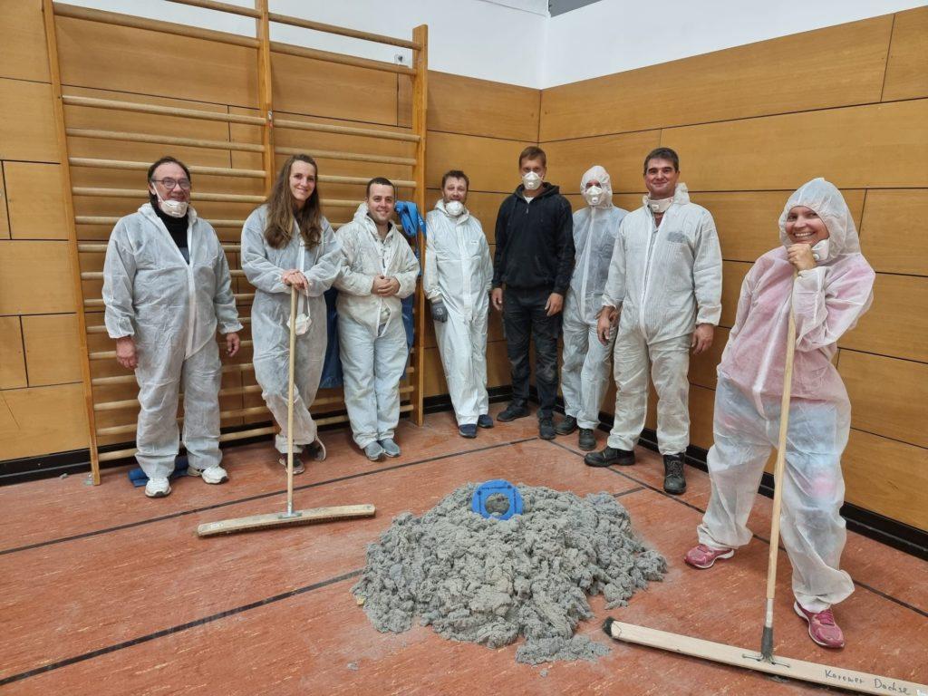 Am frühen Freitagabend fanden sich viele fleißige und zum Teil schwindelfreie Helfer in der Sporthalle ein. Ziel war es die Heizkörper an der Decke von der jahrelangen Staubschicht zu befreien. Mit fachmännischer Planung von Miki Kraft und Dachse-Hallenwart „Arno“ stand der Schlachtplan schon Tage zuvor. Nach dem Aufbau von drei Rollgerüsten ging es für einige Helfer in die Höhe. „Bewaffnet“ mit Laubbläsern und eingekleidet in Ganzkörper-Maler-Anzügen wurde der Staub von den Heizkörpern geblasen. Unten sorgte ein „Besentrupp“ dafür, dass die dicken Staubflusen den Weg aus der Halle fanden. Ein Müllsack mit 240 Liter Fassungsvermögen wurde so an diesem Abend bis zum Rand befüllt. Gegen 23 Uhr machte dann Arno das Licht in der Halle aus.