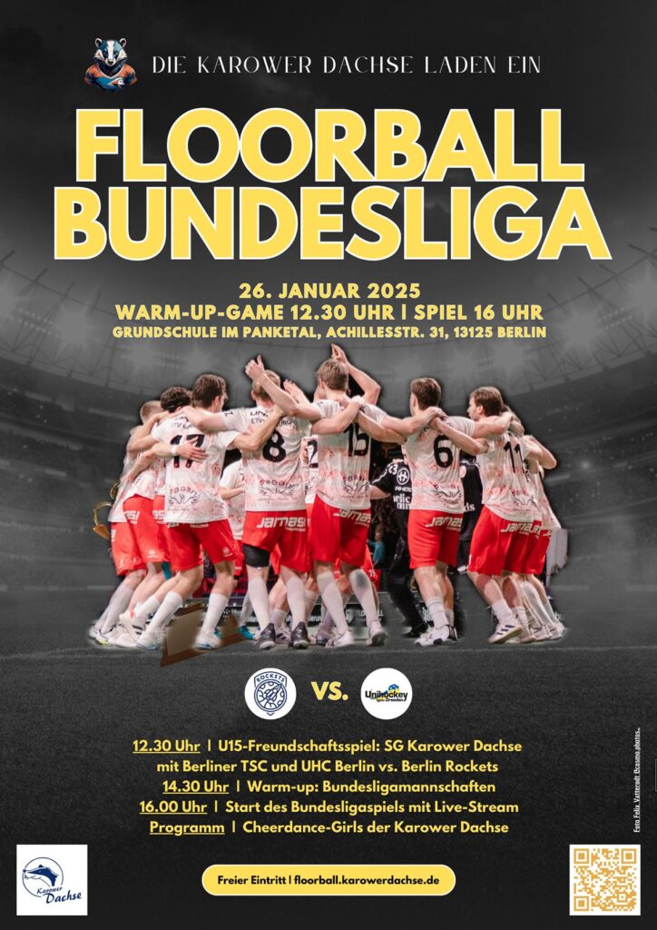 Im Anschluss findet in der gleichen Halle um 16 Uhr das Bundesliga-Spiel BERLIN ROCKETS – UNIHOCKEY IGELS DRESDEN statt. Dazu tritt vor dem Bundesligaspiel die Tanzgruppe Sassy Stars der Karower Dachse auf.
