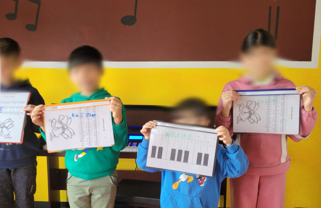 In den Räumlichkeiten der Musikschule wurde dann den Kindern eine Einführung in die musikalische Welt gegeben. „Wir haben ein kleines Karussell gemacht, sodass die Kinder am Schlagzeug und dem Klavier ausprobieren konnten“, erzählt Eva Klatte. Anhand von Farben und Zahlen wurden die beiden Instrumente den Kindern vermittelt. So wurden beim Schlagzeug die Trommeln mit unterschiedlichen Farben gekennzeichnet. Danach konnten sich die Kinders selbst am lautstarken Instrument ausprobieren und erste Schlagzeugfolgen anhand farbiger Notenbilder üben. Beim Klavier arbeiteten die Mitarbeiter*innen der Dachse-Musikschule mit Zahlen. So wurden die ersten ein, zwei Liedern durch die Kinder erlernt.