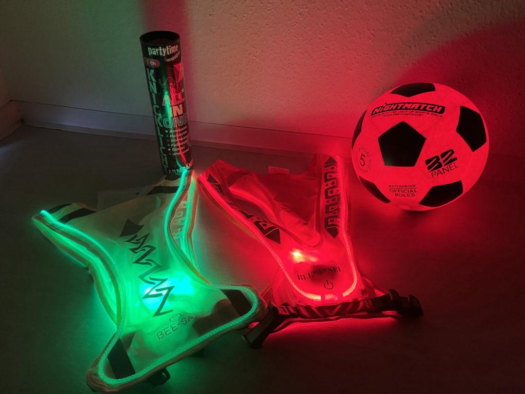 Und aus der eher verrückten Idee entwickelt sich Schritt für Schritt ein konkretes Bild – Beleuchtung der Tore, fluoreszierendes Reflektor-Klebeband für die Linien, LED-Westen für die Teams sowie Knicklichter sollen am Sonntag-Abend die dunkle Sporthalle in eine leuchtende Fußball-Spaßwelt verwandeln. Einige mutige und abenteuerlustige Freizeitkicker haben sich bereits zum Kurs angemeldet. Bis zu 24 Fußballspieler können bei der Premiere des Events dabei sein. Ein paar wenige Restplätze sind aktuell noch über die Kursseite (Sonntag, den 27. März, Spalte Märzaktion) verfügbar. Bei dämmerndem Licht geht es am Sonntag ab 19 Uhr dann beim ersten Dunkel-Fußballevent bei den Karower Dachsen auf dem Hallenparkett rund. Und es soll nicht der letzte Fußball-Kurs dieser besonderen, einmaligen Art bleiben…