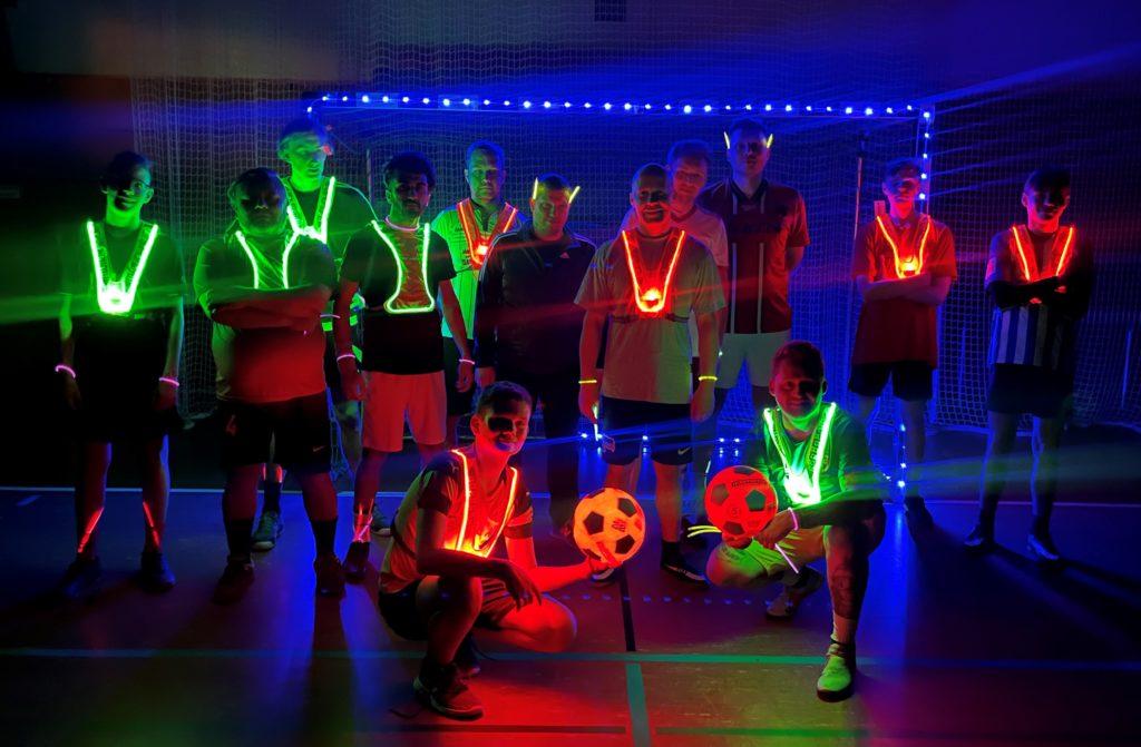 Die Idee für diese besondere Aktion hatte Christian Drathschmidt. „Ich hatte vom Energiespartag gelesen, den es am 5. März gab. Dann dachte ich, dass es doch irgendwie möglich sein muss bei Dunkelheit noch Fußball zu spielen. LED-Fußballbälle gibt es ja mittlerweile. Aber auch Spieler, Tore und das Spielfeld sollten irgendwie leuchten“, so der Fußballtrainer bei den Karower Dachsen. Und aus der eher verrückten Idee entwickelt sich Schritt für Schritt ein konkretes Bild in der Planung: Beleuchtung der Tore mit LED-Lichterkette, fluoreszierendes Reflektor-Klebeband für die Linien, LED-Westen für die Teams sowie Knicklichter sorgten für eine leuchtende Fußball-Spaßwelt.